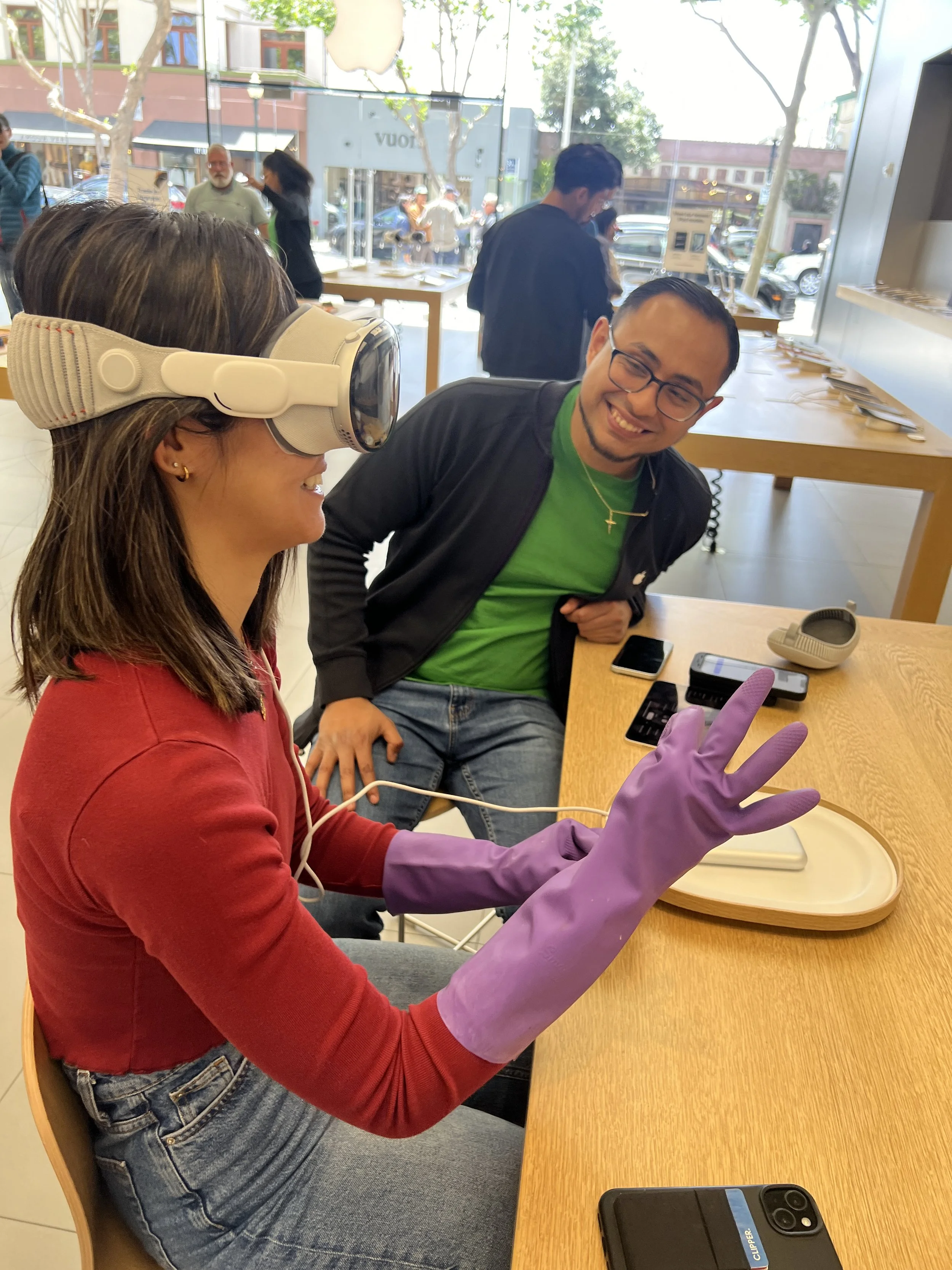 Trying out the Apple Vision Pro while wearing kitchen gloves to simulate factory worker equipment - it worked!