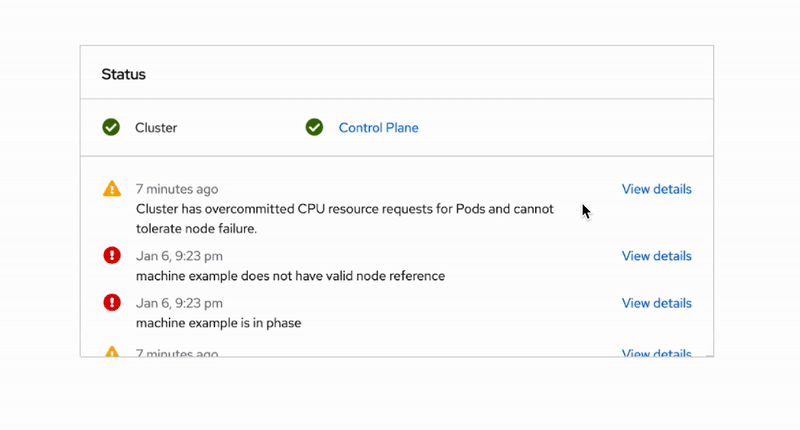 Admins use status cards to understand the statuses of components of their applications. If the status is good, then all is well. If there’s a warning or it’s in critical condition, admins need to address it or delegate it to someone else.